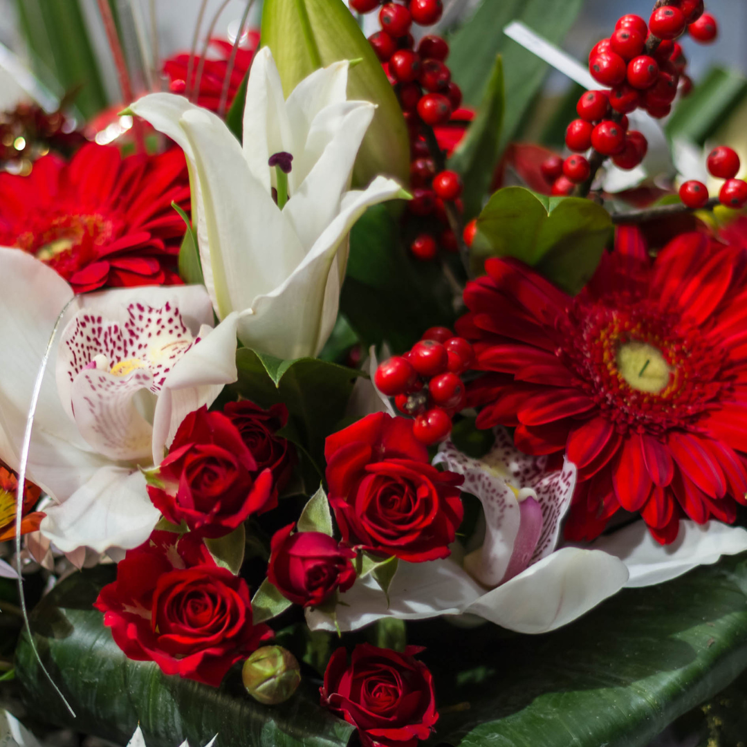 Barberton daisies symbolise religious worship, perfect for Christmas! Additionally, Red Roses and White Lilies add to the symbolic nature of Christmas.